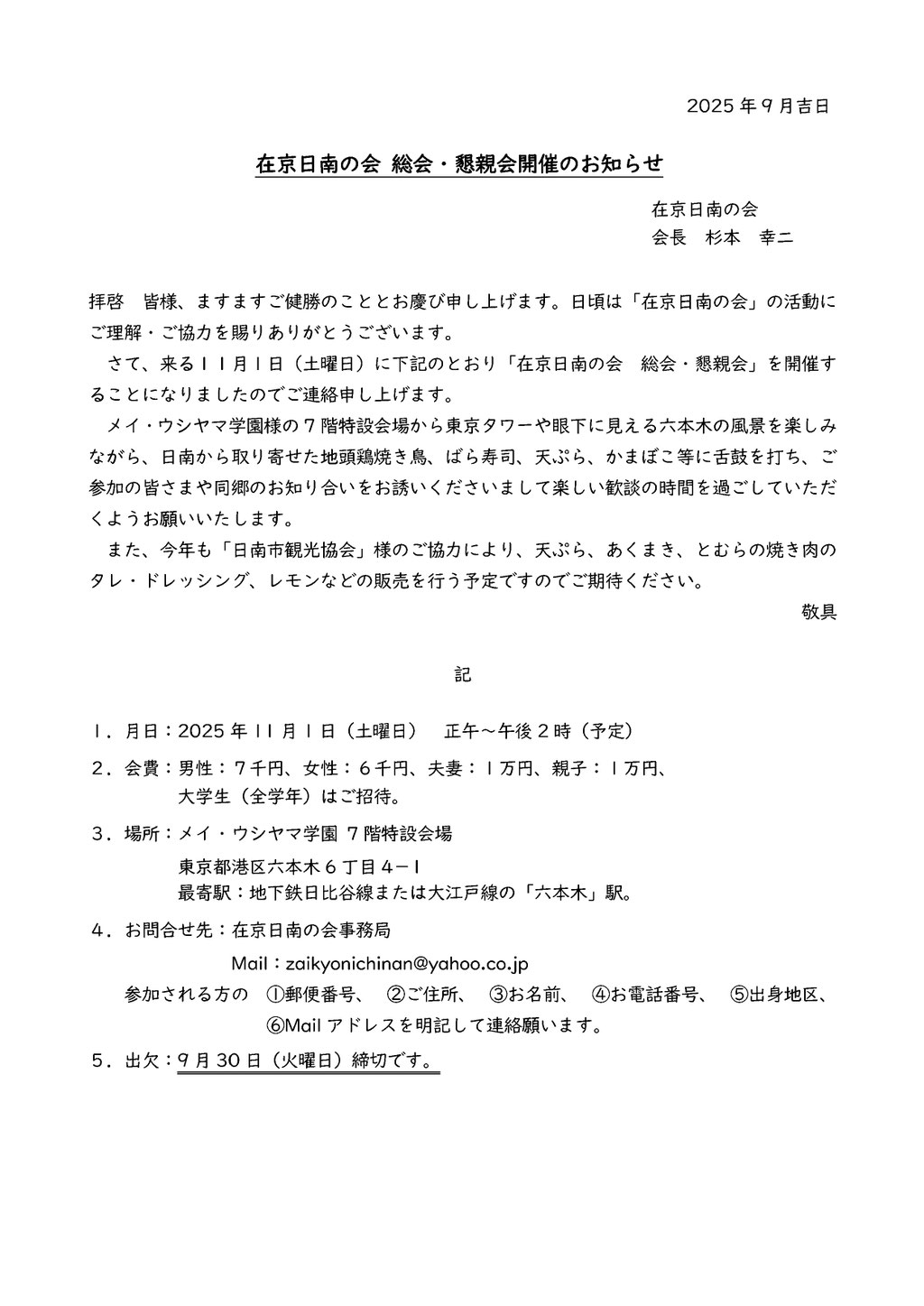 拝啓、皆さま、ますます御健勝のこととお慶び申し上げます。平素は、在京日南の会の運営にひとかたならぬ御愛顧を賜り、厚く御礼申し上げます。